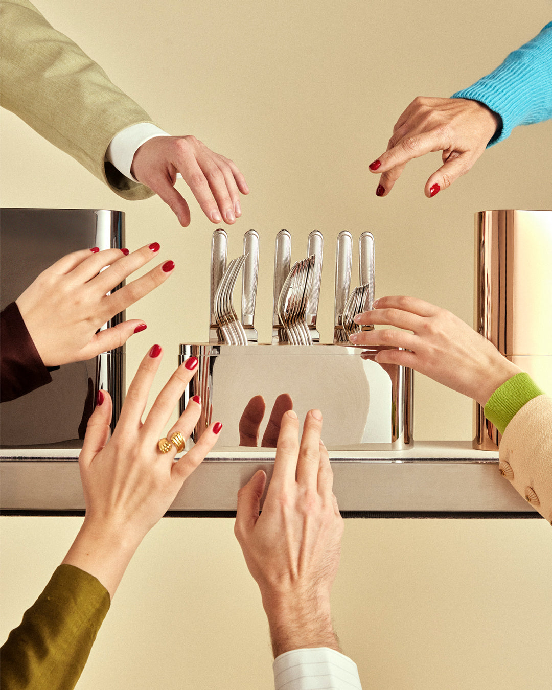 A mirror polished stainless steel case with a white oak wood interior disk stores the cutlery. Inspired by the oblong shape of the Parisian “Place de la Concorde”. Concorde combines beauty with convenience.